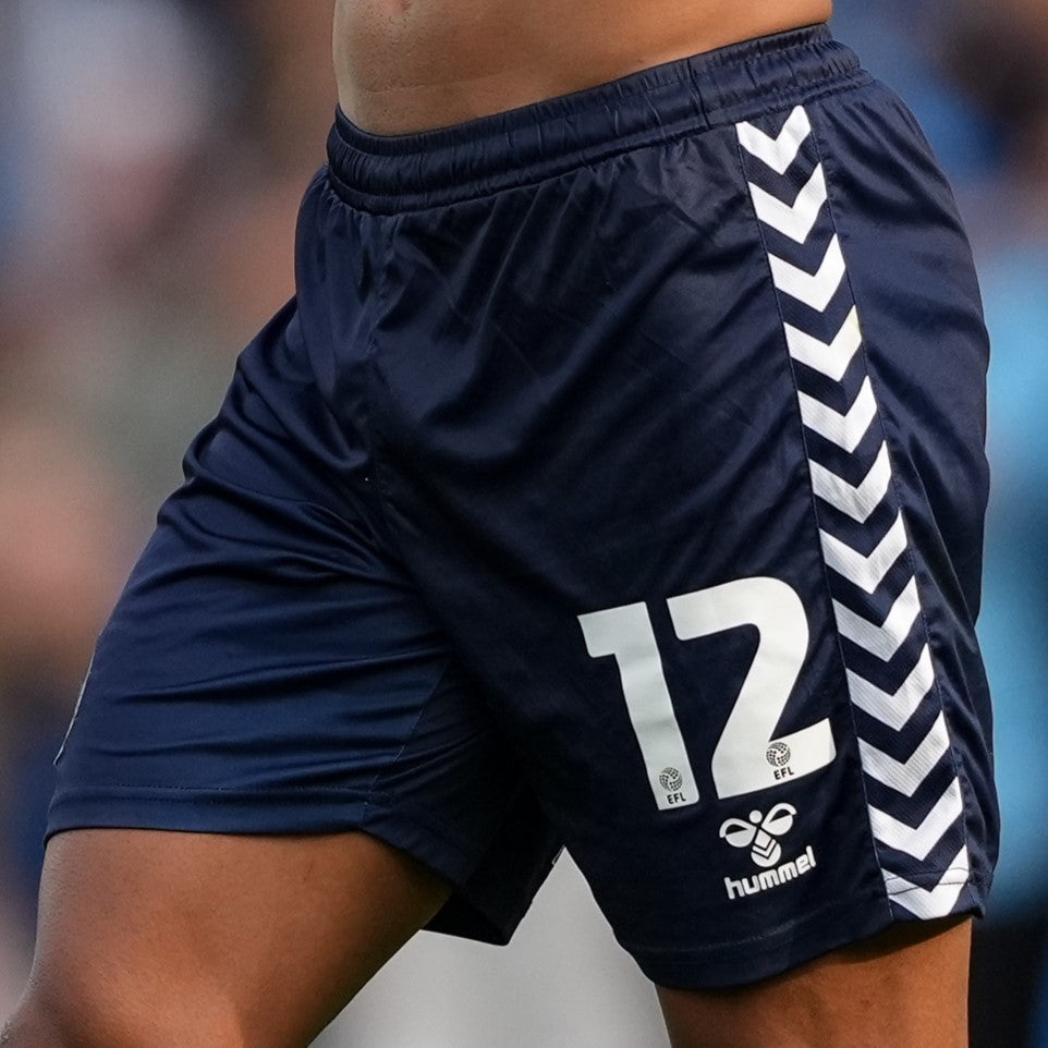 The official replica shorts of the Wycombe Wanderers home kit, complete with hummel logo and chevrons, WWFC badge and Cherry Red Records sponsor label. Check size guide before ordering.