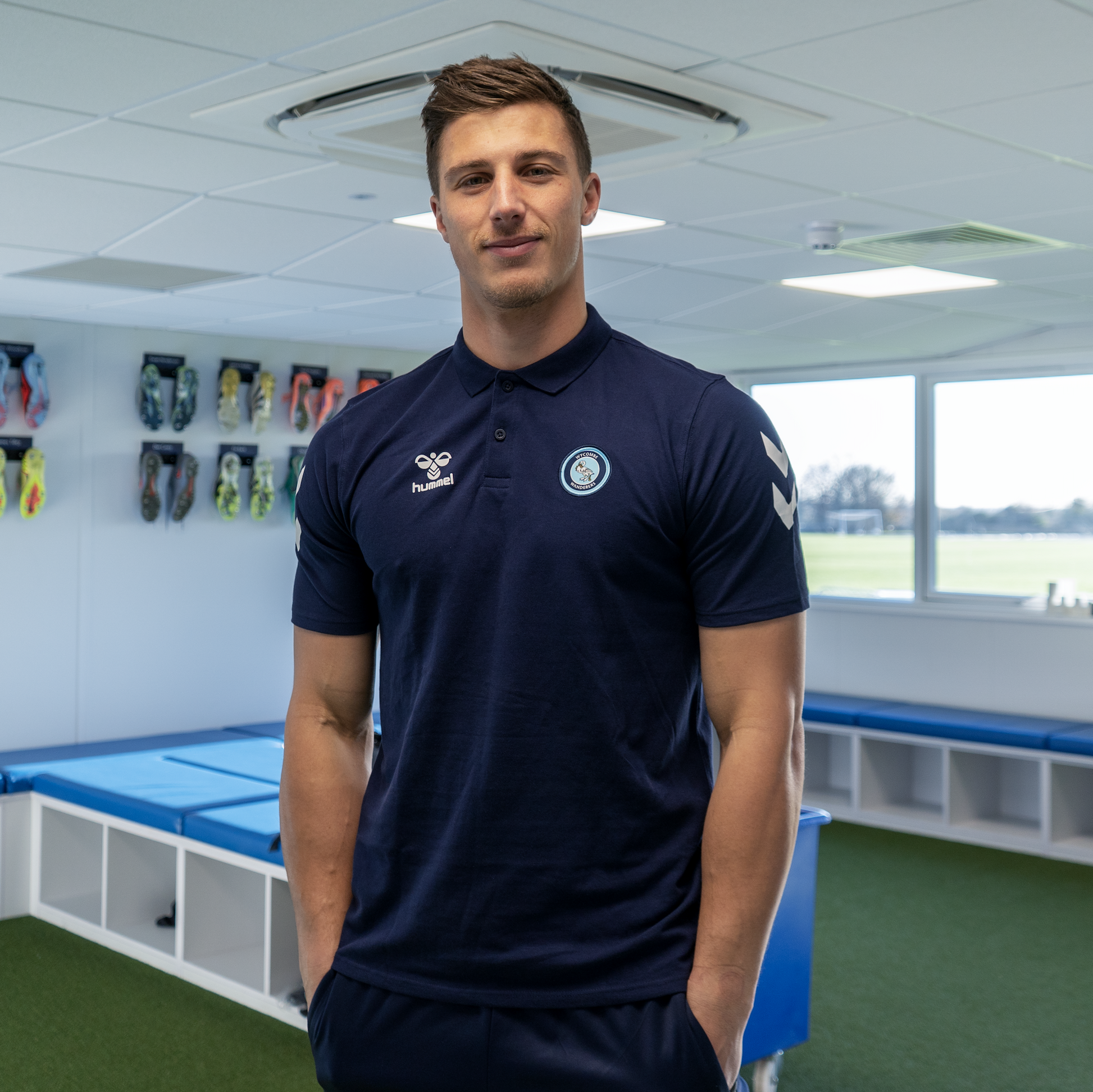 Hummel GO 2.0 cotton Chevron Polo in Navy with Wycombe badge and white chevrons on sleeve.